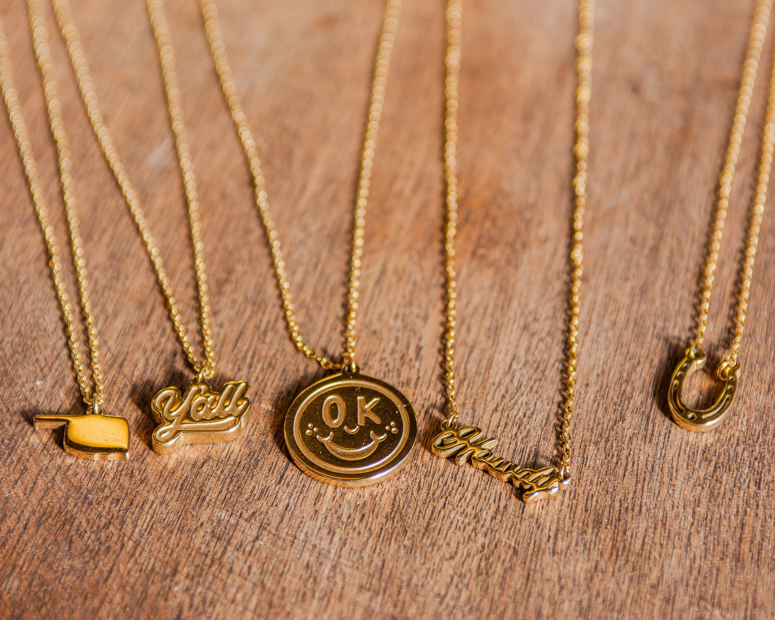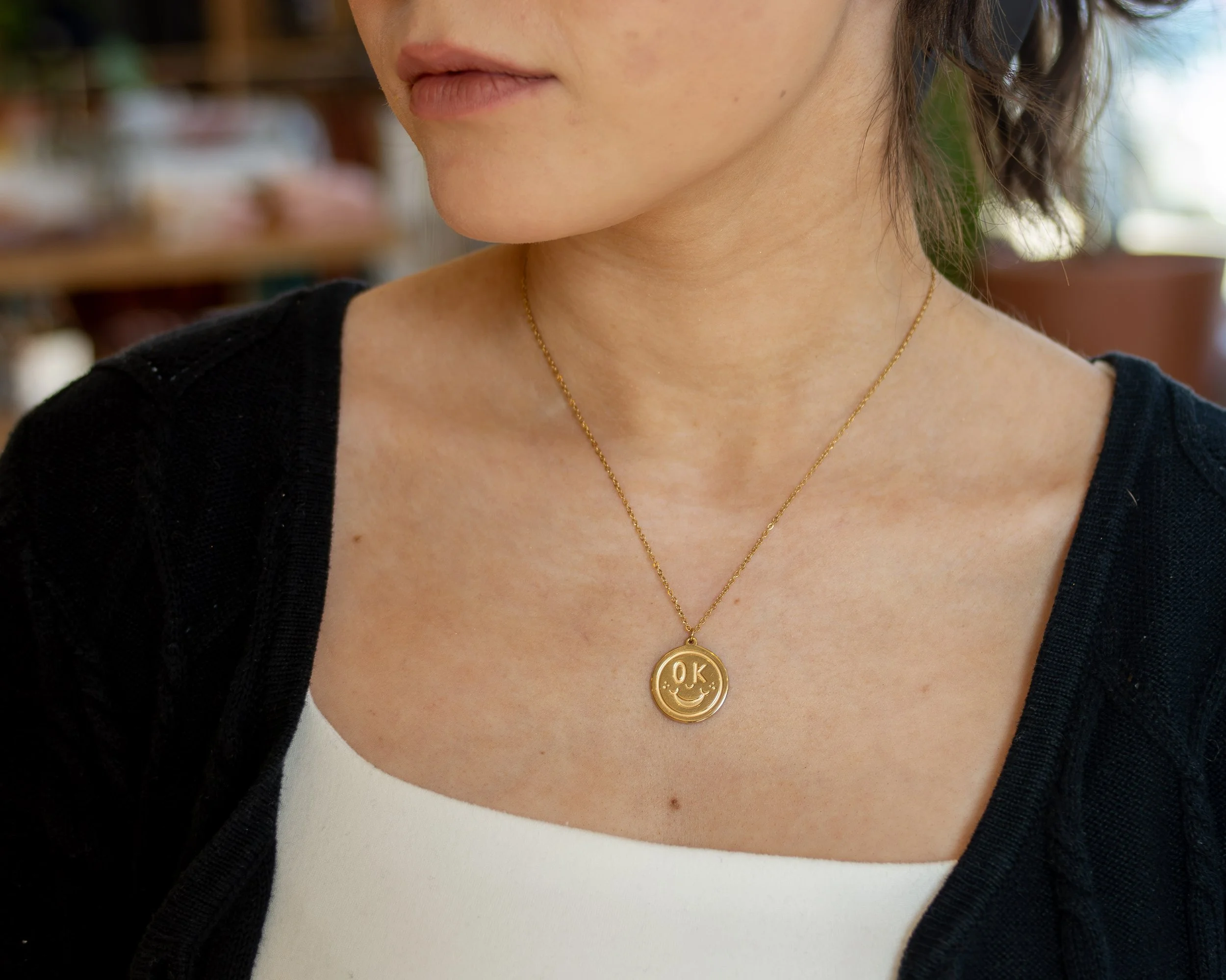 Shop › A-OK Smiley Necklace Image 1 of 4 Image 2 of 4 Image 3 of 4 Image 4 of 4 A-OK Smiley Necklace $29.00 16 in length. 18k gold plated stainless steel. Designed by Shop Good. Ethically made. Add To Cart Added! 16 in length. 18k gold plated stainless steel. Designed by Shop Good. Ethically made.